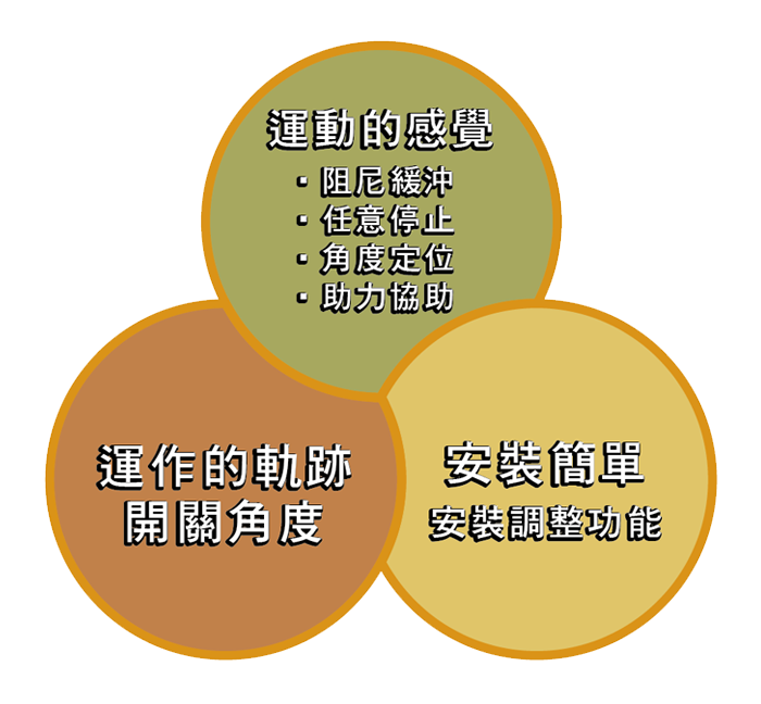 以阻尼緩衝、任意停止、角度定位、助力協助等動作感覺、安裝調整、開閉角度和軌跡等控制技術為背景,呈現SUGATSUNE高度技術能力和產品系列的運動控制技術。 為您提供對“運動感覺”、“安裝調整”、“開閉角度和軌跡”進行綜合控制的技術。